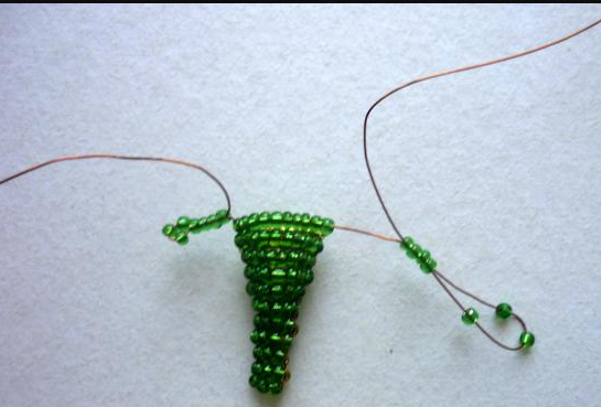 2. Виконує ще три ряди, додаючи по одній намистині в кожному ряду. Тепер вивести задні лапки. Дріт відвести убік. Нанизати 4 зелені і одну жовту намистину або три зелені (як на фото), нижній фрагмент лапки перекрутити, ввести в зелені намистини і вивести біля тільця.