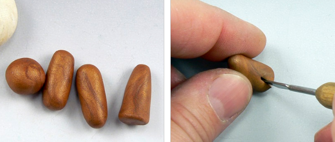 1. Знадобиться біла та коричнева полімерна глина, овечка може бути й інших відтінків. Скачати кульки діаметром 2,5 мм. З коричневої глини сформувати чотири ніжки. Ножем розрізати край, надавши форму копита.