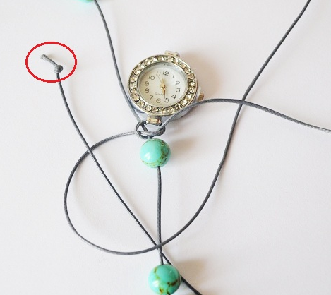 1. Відрізати волосінь, довжина якої вдвічі більша, ніж ширина зап'ястя. Визначити середину та розмістити на ній годинник, використовуючи одну з частин для кріплення ремінця. Нанизати намистини, як показано на фото.