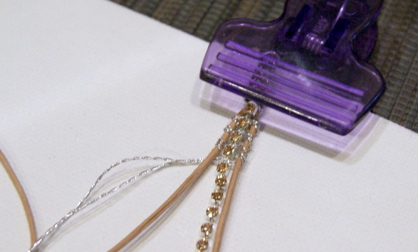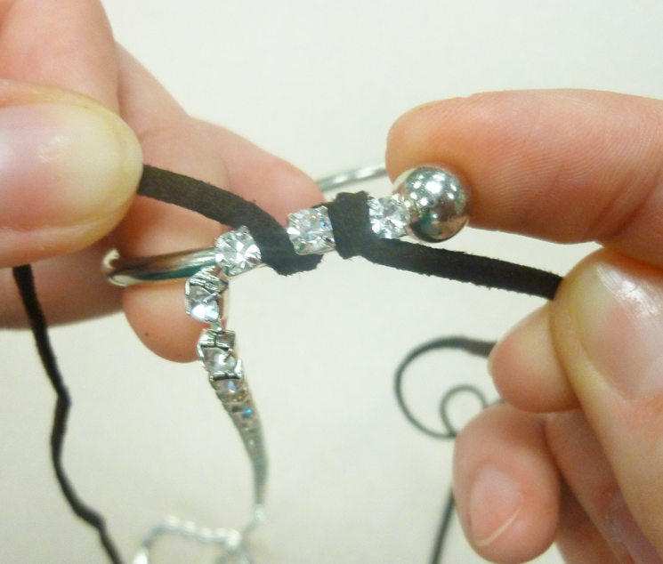 1. За допомогою кусачок зробити відрізок зі стразової стрічки, який трохи довший, ніж вимагає зап'ястя. Два відрізки замшевого шнура відповідних по довжині відрізаного ланцюжка . Край майбутнього виробу зафіксувати в одній частині застібки. Як це зробити залежить від обраного виду. Для кращого кріплення використовувати клей.