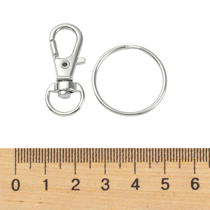 У наборі: Застібка Поворотний Карабіни-лобстер: 31x12.5x5.5мм, отвір 5x9мм, 5шт Роз'ємні металеві кільця для ключів: 25x2.5мм, внутрішній діаметр 22мм, одинарний дріт: 1.25мм, 5 шт.